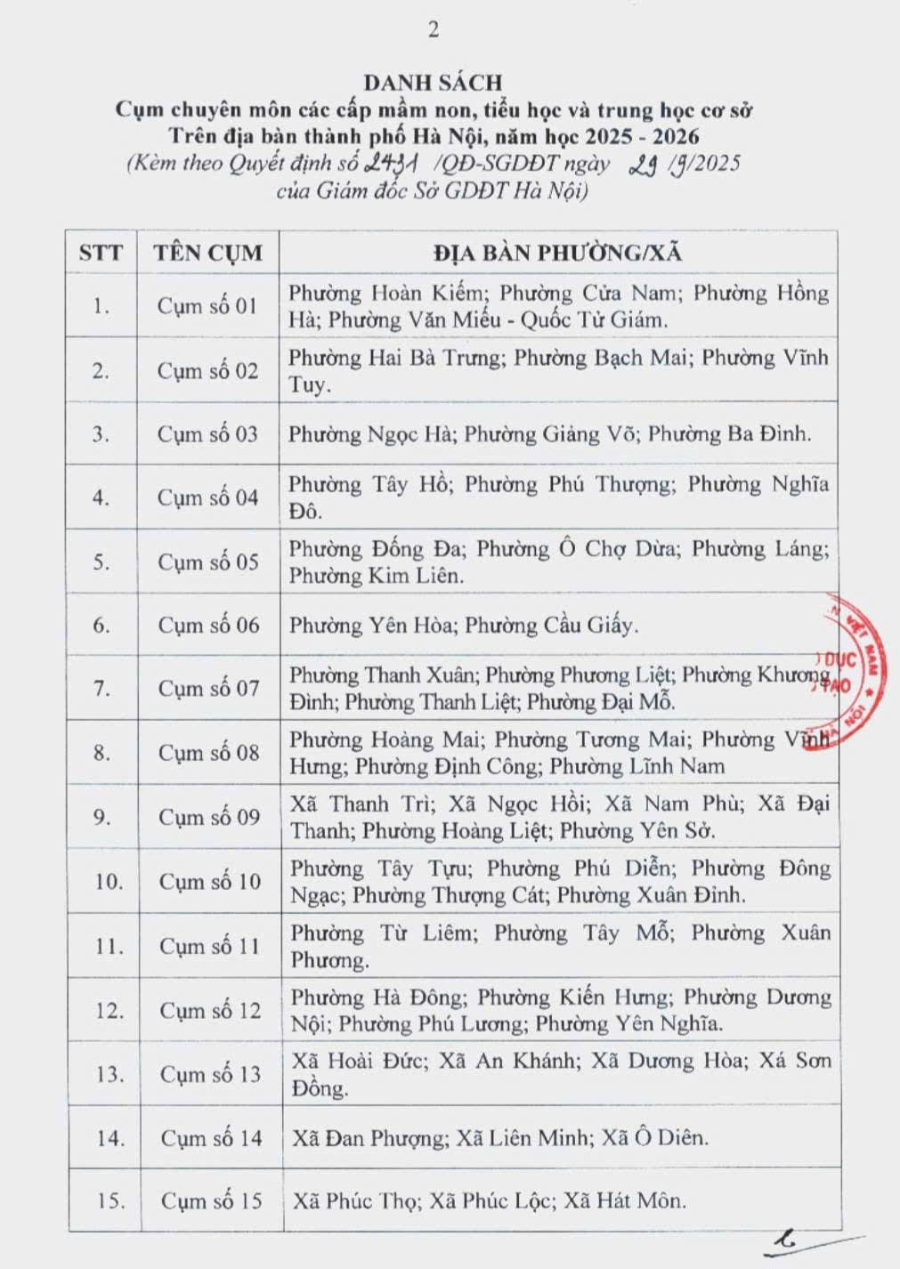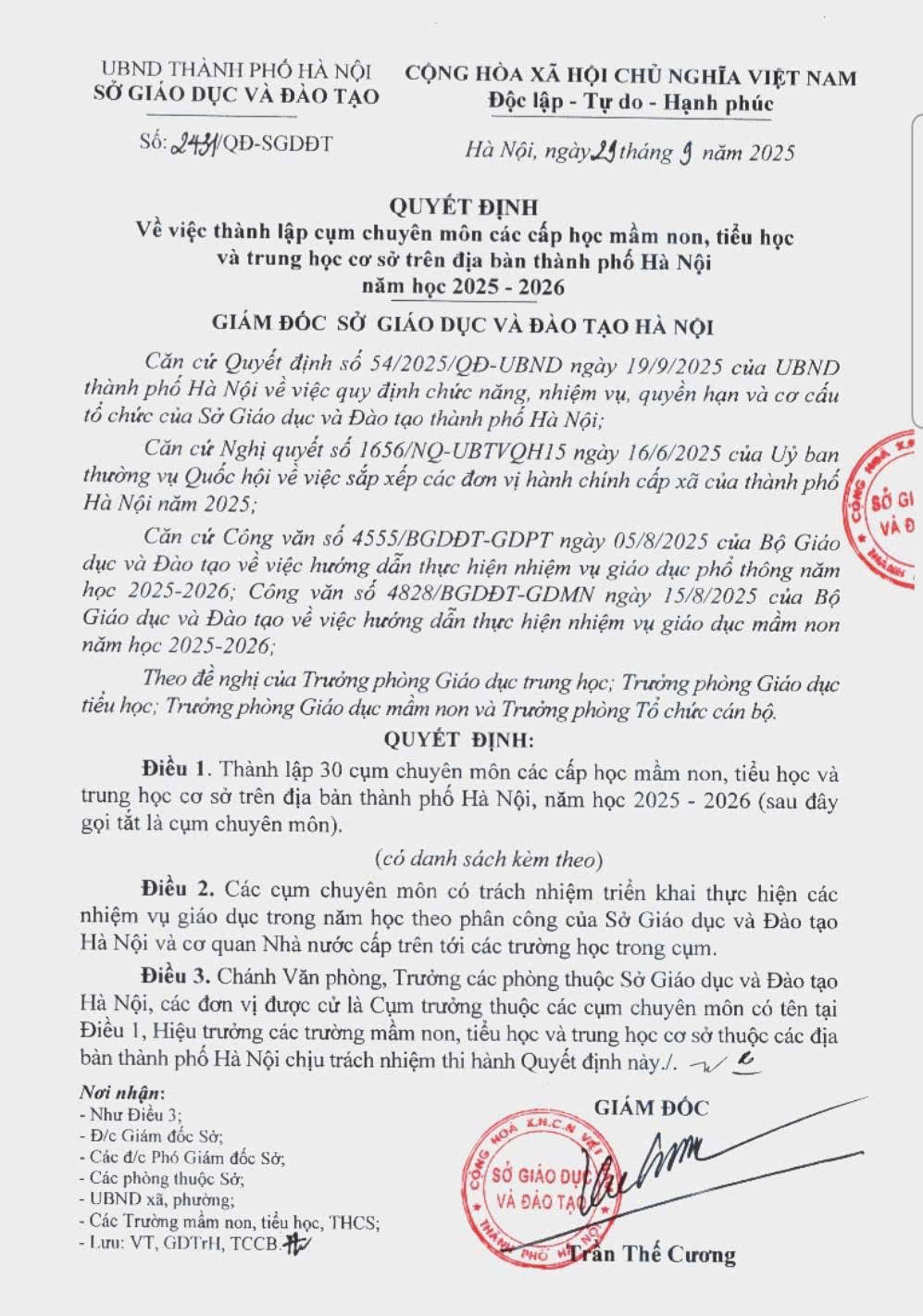 Quyết định về việc thành lập cụm chuyên môn các cấp học mầm non, tiểu học và trung học cơ sở trên địa bàn thành phố Hà Nội năm học 2025-2026