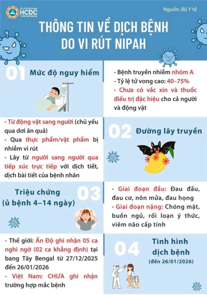 Virus Nipah - là một bệnh truyền nhiễm nhóm A lây từ động vật sang người hoặc tiếp xúc với vật phẩm, thực phẩm bị nhiễm virus. Theo ghi nhận tỷ lệ chết/ mắc ở các trường hợp nhập viện khoảng 40-75%.