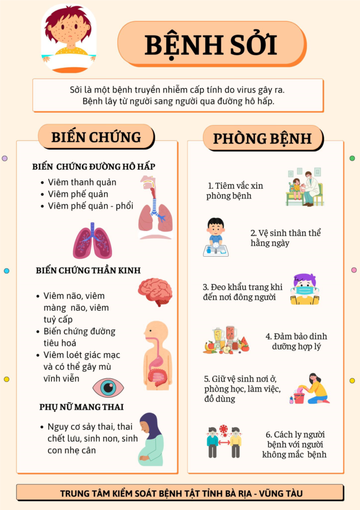 Ban sởi dạng dát sẩn, ban gồ trên bề mặt da, không đau, không hoặc ít ngứa và không mưng mủ, nổi theo thứ tự.Các biến chứng của bệnh sởi