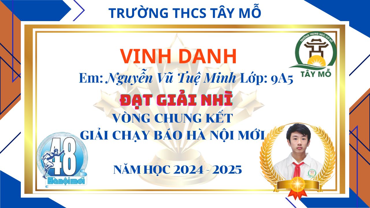 Trong năm học 2024–2025, em Nguyễn Vũ Tuệ Minh, học sinh lớp 9A5 trường THCS Tây Mỗ đã xuất sắc đạt Giải nhì tại vòng chung kết cuộc thi chạy báo Hà Nội mới – một sân chơi thể thao truyền thống có uy tín và quy mô lớn của Thủ đô.